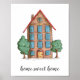 Joli panneau d'habitation avec une illustration d'un immeuble d'appartements et quelques arbres. Personnalisez le texte avec votre propre message si nécessaire. Illustré et dessiné par Patricia Alvarez.