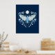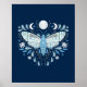 Poster d'illustration moderne bleu et blanc Abstrait de la teigne céleste. Ce dessin magique mystique abstrait de saumons comporte une belle illustration complexe de papillon de nuit avec une pleine lune et des phases de lune croissant. Orné de fleurs sauvages, et de fleurs florales. Esthétique sorcière bohème.