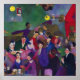 Vision impressionniste d'un bar bondé. Différentes tailles disponibles. Un groupe de personnes dans un bar est capturé dans cette image. Les murs du bar sont peints en rouge avec des accents verts et un cercle jaune vif avec un centre brun foncé est au premier plan. Sur le mur d'extrême gauche du bar est accroché un tableau représentant un homme et une femme, tandis qu'à l'extrême droite, un tableau représentant une femme violette. Les gens du bar parlent et rient, créant une atmosphère chaleureuse et accueillante.