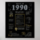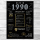 Plongez dans l'année 1990 avec notre captivante affiche numérique d'anniversaire, regorgeant de faits historiques, d'événements marquants et de récits envoûtants du passé. Ornée d'élégantes touches dorées et argentées sur un fond noir saisissant, cette affiche d'anniversaire dégage un charme intemporel.