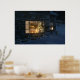 En regardant dans les fenêtres du chalet une nuit d'hiver gelée juste avant Noël. Des bougies rouge vif sont allumées, envoyant une lumière chaude par-dessus la neige. Le sapin de Noël et le manteau sont décorés de cramoisi et de boules d'or. Un chat calico regarde par la fenêtre un poulet assis à l'extérieur sur le rebord, et une paire de renards se baladent au coin de la petite maison.