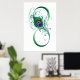 The symbol of infinity with a bright, green, artistic peacock feather on a white background. Tattoo style.
