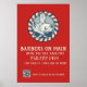 Affiche élégante avec badge de coiffeur rouge blanc et bleu rétro sur arrière - plan rouge. Customisez avec le nom et les détails de barbershop, et ajoutez votre code QR personnalisé pour votre site Web ou comptes de médias sociaux.
