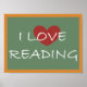 Cette affiche affiche le texte "I Love Reading" sur un arrière - plan de tableau de bord. Il s'agit d'un article intéressant pour les couloirs scolaires, les salles de classe ou les bibliothèques.