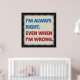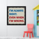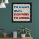 Poster avec design avec le texte "I'm Always Right. Même quand je me trompe" en bleu et en rouge.