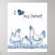Affiche J'Aime Mes Poules Bleu Poulet Peinture Rustique De