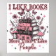Design coloré et dynamique, avec une pile de livres avec des fleurs, des papillons et des champignons. Le texte coloré dit : "J'aime les livres plus que les gens". Ce design est disponible sur une grande variété de produits.