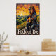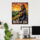 Ce tableau saisissant capture un lion majestueux, orné de lunettes de soleil et d'une veste en cuir, livrant passionnément une "confiture d'heure d'or" sur une guitare électrique d'un rocher proéminent. La scène surplombe une vallée verdoyante aux arbres épars, baignée par la lumière chaude et spectaculaire d'un coucher de soleil. L'utilisation par l'artiste d'un coup de pinceau texturé et audacieux met l'accent sur la beauté robuste et l'attitude "Rock or Die".