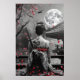 A beautiful illustration of a Japanese samurai woman with a katana and traditional tattoos, sitting under the full moon. Calm, cinematic composition inspired by Japanese culture and tattoo art. Perfect for posters and prints.