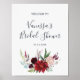 Cette affiche de bienvenue pour la soirée de mariage en Bourgogne dans le jardin d'automne est parfaite pour une douche de mariage d'automne. Le design floral présente de superbes fleurs aquarelles roses, rouges, bleu marine et Bourgogne, des fleurs et des feuilles vertes disposées dans un bouquet d'automne animé. Personnalisez l'affiche avec le nom de la mariée et la date de la soirée.