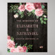 Maison de ferme romantique et rustique avec un panneau d'accueil mariage avec de beaux coins rose rose et rouge bordeaux avec un feuillage vert naturel et deux petits coeurs rouge foncé sur une grange brun foncé comme arrière - plan. +++++++++++++++++++ Facile à customiser avec les noms de mariée et de mariée, date et lieu. +++++++++++++++++++ Convient pour les cérémonies et réceptions mariages du jardin extérieur du printemps ou de l'été.