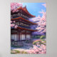 L'atmosphère paisible d'un jardin de temples japonais est complétée par les couleurs vives du printemps. Les cerisiers en fleurs sont hauts, jetant des pétales roses sur les trottoirs en pierre. Le jardin abrite également une variété de fleurs roses et blanches, ce qui ajoute au cadre paisible.