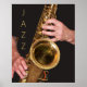 Pour les fans de jazz ! Décorez un espace avec cette affiche photographique qui montre l'image d'un jazzman jouant sa corne de saxophone ténor, couleur or usée, avec le mot "JAZZ" imprimé en lettres de blocs de couleur or. Customisez la taille de votre affiche et d'autres options selon vos besoins.