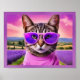 Poster avec imaginaire fantaisie. Un chat jazzy dans un col à la mode et des lunettes de soleil violet se dresse sur un fond de champ de lavande. Parfait pour tous ceux qui aiment les chats modernes, les humours, et les premières vibrations d'été. avec l'art imaginaire lunatique.