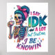 Design coloré et dynamique, avec un squelette féminin sirotant du café. Le texte coloré dit : "Je dis beaucoup IDK mais croyez-moi, je suis au courant". Ce design est disponible sur une grande variété de produits.