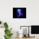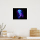 Grande méduse bleue, artistiquement dessinée, brillante, brillante, avec de longues tentacules sur arrière - plan noir avec bioluminescence violette. Méduse brillante.