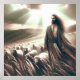 Un dessin dramatique d'affiche de création d'arts numériques de Jésus debout dans un champ de moutons comme berger. Cet art biblique chrétien est unique et peut être utilisé comme décor mural et ou parfait pour un cadeau pour quelqu'un qui aime l'art religieux.