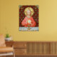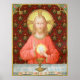 Dans cette splendide image, Jésus est assis à une table qui est fixée pour la Pâque et recouverte d'un chiffon bleu et blanc. Il est vêtu d'un vêtement rouge doux et accrocheur. C'est Maundy ou Jeudi Saint et Sa Dernière Cène avec Ses apôtres. C'est le moment où Il institue le sacrement de la Sainte Communion ou de l'Eucharistie. + La figure de Jésus est isolée d'un arrière - plan rouge foncé à motifs d'artichauts stylisés en forme de losange. L'humeur ici est solennelle. Laissant ses yeux au ciel, Jésus lève sa main droite en bénédiction. À sa gauche, Il tient une grande hôte, le pain eucharistique, sur le chalet rempli de vin. En latin, dans un banderole sous la scène, sont les mots de la consécration : "This is My Body.. This is My Blood" ("Hoc est corpus meum... Hic est sanguis meus"). En souvenir de Lui, à chaque messe, le prêtre réagit à cette action sacrée qui transforme le pain et le vin ordinaires en Corps et Sang du Christ. + Crédit d'image (SAU 045) : Impression dévotionnelle antique de Jésus Instituting the Holy Eucharist, publiée à l'origine dans la chromolithographie par la Socièté de St. Augustin, Bruges, Belgique, fin 19ème siècle, de la collection privée de l'architecte de l'éphémère religieux.