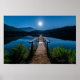 Une affiche avec une belle photo d'une jetée en bois qui s'étire sur un lac calme. Ciel nocturne couvert d'étoiles et belle pleine lune.