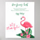 Baby shower invitation design avec flamingo rose avec frondes de feuilles de palmier vert luxuriant et fleurs d'hibiscus tropical. "Aloha Baby". Un motif à fleurs tropicales aux couleurs arrière - plans noires habille le dos de la carte. Flamingle !
