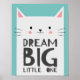 Jolie affiche pour une chambre de bébé ou d'enfant. Il y a une illustration d'un chat blanc avec un doux sourire sur le visage. Sur son ventre se trouve une citation inspirante qui dit "Rêve grand petit(e) un(e)". Le fond est de couleur menthe. Parfait pour la chambre des filles et des garçons.
