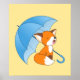 Un petit renard mignon et endormi avec de grandes oreilles et une queue bosselée est en train de bâillonner sous un parapluie bleu.