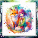 Jolie aquarelle d'art pour la chambre d'une fille ado. Un renard avec une fille anime en rose, vert, bleu et orange.