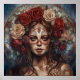 Dia de los Muertos Day of the Dead Art Avec un beau portrait d'une femme au maquillage crânien sucré, cheveux foncés et roses rouges.