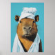 Portrait charmant et fantaisiste d’un capybara, le plus grand rongeur du monde, habillé en tenue spa. L'animal est drapé dans une serviette blanche avec un autre enveloppé autour de la tête, dressé contre un arrière - plan bleu apaisant. L’expression calme et sereine du capybara donne l’impression de profiter d’un moment de détente, ajoutant une touche d’humour et de chaleur à la scène. Le brossage détaillé met en valeur la fourrure du capybara et la texture douce des serviettes, faisant de cette oeuvre une pièce délicieuse et légère.