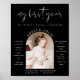 Ce tableau d'étape de premier anniversaire comporte une police manuscrite pointue et une combinaison de couleurs en noir et blanc avec une jolie photo voûtée au milieu. Cette année, une affiche de mise en valeur est parfaite pour votre fête d'anniversaire de garçon ou de fille. Toutes les couleurs sont modifiables ! Cliquez sur le bouton bleu 'modifier en utilisant l'outil de conception' dans la section de personnalisation pour utiliser l'éditeur complet.