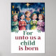 Illustration aquarelle d'enfants chantant des chansons sous un ciel étoilé avec une étoile brillante de Bethléem. Les enfants sont vêtus de vêtements victoriens. Le verset "Pour nous un enfant naît" est écrit en calligraphie en bas. L'arrière - plan abrite un village aux fenêtres éclairées