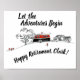 Design d'affiche de la fête de retraite à thème de voyage - Rustique, vintage style affiche une ligne simple, mignonne dessin en noir et rouge d'une remorque de voyage de camping vintage et voiture antique dans la campagne avec un arbre et quelques fleurs. Lit "Let the Adventures Begin" en haut et "Happy Retirement" avec un nom personnalisé en bas. Sur un arrière - plan blanc solide pour faire simple design pop. Décor de voyage inspiré pour la célébration de la retraite et les aventuriers de la flânerie. Un cadeau amusant pour les parents à la retraite et un décor RV. NOUS AVONS PLUS D'AFFICHES DE VOYAGE ET DÉCOR DE PARTI RETRAITE, AINSI QUE CE DESIGN VINTAGE VOYAGE SUR D'AUTRES PRODUITS dans notre boutique Zazzle.com/angela65.