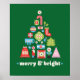 Illustration de Noël joyeuse et brillante pour les fêtes de Noël. Des illustrations stylisées de cadeaux, de bonbons, de bas, d'ornements créent un arbre amusant et coloré. Les couleurs comprennent les couleurs traditionnelles de Noël, le vert et le rouge, ainsi que le bleu, le rose et le vert clair.
