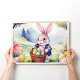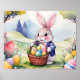 Célébrez Pâques et le moment de bonheur du printemps avec ce "Happy little lapbit" avec un adorable lapin portant un manteau bleu et tenant un panier d'oeufs de Pâques contre un arrière - plan de printemps gai.