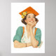 Une jeune femme joyeuse brille avec fierté dans cette illustration de graduation de style vintage, avec un casquette orange orné de fleurs jaunes, évoquant un esprit nostalgique et optimiste.