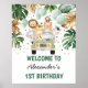 Ce magnifique design présente d'adorables aquarelles illustrant des animaux safari et une végétation tropicale luxuriante en vert et or. Les champs de texte sont entièrement modifiables. Vous pouvez modifier le libellé en fonction de votre événement, p.ex. anniversaire, baby shower / aspersion, baptême, baptême, baptême, baptême, jour de dénomination, etc
