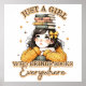 Illustration de charme montrant une fille penchée sur une pile de livres et une pile de livres sur la tête. Le texte coloré dit : "Juste une fille qui apporte des livres partout". Ce design est disponible sur une grande variété de produits.