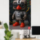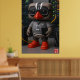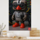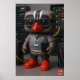 Kagu travaille au datacenter. Cette image est d'une figurine stylisée, comme un oiseau de Yanbaru. Il est habillé d'une tenue qui laisse penser à un personnage high-tech, avec un maillot de polo gris, des shorts noirs avec un motif ondulé sur l'ourlet, et des chaussures rouge vif. La figurine est munie de lunettes épaisses et noires, et d'un motif rayé noir et blanc en haut de la tête, qui ressemble à une coiffure. Il tient une tablette noire dans sa main gauche et porte un bandeau avec un badge autour du cou. La figure se trouve dans ce qui semble être une salle serveur ou un datacenter, avec des racks de lumières clignotantes visibles dans l'arrière - plan. Le style général rappelle la silhouette d'okinawan yanbaru kuina ! grâce à sa grande tête et son petit corps, bien que celle-ci ait une texture plus réaliste. Dans le coin inférieur droit de l'image, il y a un timbre rouge avec ce qui ressemble à des caractères japonais.