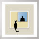 En svart katt sitter vid ett fönster och ser en silhuett av en superhjältefigur i det motsatta fönstret.