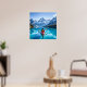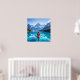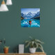 Poster with an illustration of a man kayaking in the ocean by the snow topped mountains. Pretty serene blue tranquil water and pine trees surround him on a peaceful journey.
