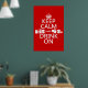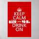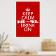This reads Keep Calm and Drink On, in the style of the classic keep calm poster.  It is decorated with silhouettes of a wide range of drinks all lined up in the middle.  It's a fun classic design, great for advertising or promoting events.