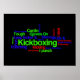 Cette affiche noire personnalisée présente un design de texte appelé "nuage de mots". Le sujet principal est Kickboxing et les autres mots soutiennent pourquoi le kickboxing est si génial ! Les couleurs du texte sont si vibrantes qu'elles sont fluorescentes ; le vert, le bleu et le rouge sur un arrière - plan noir. Choisissez votre taille et votre type de papier. Ce nuage de mots a été créé avec mes mots en utilisant wordle.net. Conçu par Nature's Essence in Print. Image151