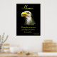 Un majestueux aigle à tête blanche glisse sur un fond audacieux, son bec pointu et son regard intense symbolisant courage et dignité. Le vol gracieux de l'aigle saisit un sentiment de résilience et de force. En haut, "Honneur" est inscrit avec élégance dans un cursif jaune gras, symbolisant la révérence et le respect. Ci-dessous, la citation profonde d'Aristote — "La dignité ne consiste pas à posséder des honneurs, mais à les mériter" — est soigneusement affichée en caractères serif au-dessus de son nom. Cette composition qui frappe visuellement célèbre la force, la sagesse et la beauté intemporelle du gardien royal de la nature.