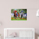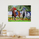 Une image colorée de deux chevaux de course avec des jockeys dans une course à cheval