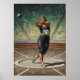 Une puissante peinture à l'huile Art Déco représentant une lance-marteaux femelle en pleine rotation, sa forme géométrique dynamique et stylisée sculptée par un dramatique éclairage par chiaroscuro contre un arrière - plan tourbillonnant et abstrait.