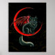 Un chat aux cheveux noirs aux yeux verts avec ailes de chauve-souris sur une lune croissant de récolte.