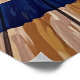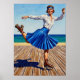 Une peinture à l'huile Art Déco dynamique représentant un joyeux patineur à rouleaux dans une jupe bleu cobalt vibrante, sa forme géométrique stylisée définie par la lumière brillante et dure d'un après-midi balnéaire contre une mer et un ciel abstraits.