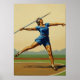 Une peinture à l'huile Art Déco dynamique représentant une javelot féminine héroïque dans une tunique bleue céruleenne au moment de la sortie, sa forme géométrique stylisée définie par l'énergie explosive et l'éclairage de chiaroscuro rude.