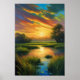 Dans un chef-d'oeuvre d'art numérique qui imite la texture riche de la peinture à l'huile, un paysage extraordinaire prend vie. Une prairie verte et marécageuse se transforme par l'embrassement d'un coucher de soleil à couper le souffle. Le ciel est peint dans les tons or et ambre, jetant une lumière chaude qui baigne le paysage dans une lumière éthérée. La sérénité de la prairie est animée par l'interaction des couleurs, créant un tableau fascinant qui saisit l'essence de la beauté de la nature.