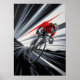Une peinture à l'huile Art Déco spectaculaire capturant une cycliste dans un jersey écarlate fougueux se penchant agressivement en un tour, sa forme stylisée définie par l'éclairage dur et théâtral de chiaroscuro contre un arrière - plan monochrome sévère.